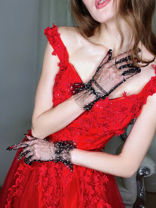 Vous aimez le style glamour et vous souhaitez vous sentir comme une star qui fait ses premiers pas sur le tapis rouge ? Complétez votre robe de soirée glamour par ces jolis gants très féminins et vous allez devenir le centre d’attention. Ces gants sont de couleur noir. La créatrice Zoryana Stekhnovych a réalisé ces gants en tulle transparent grâce à quoi ces gants pourraient très bien accompagner une robe de soirée sexy Paris. Le côté sensuel et mystique de ces gants va très bien compléter votre robe de soirée féminine. Néanmoins, il ne s’agit pas des gants ordinaires ! En effet, ces gants ont été réalisés en tulle plumetis et présentent donc des petits poids blancs. Par conséquent, ces gants sont assez extravagants et pourront bien compléter une robe de soirée originale. Vous pouvez porter ces gants avec une robe de soirée en tulle noir ou encore une robe de cocktail beige avec des broderies noires. Grâce à ces petits poids blancs, ces gants pourront être aussi portés avec une robe de soirée de couleur clair comme le beige, ivoire ou encore le crème. Le potentiel de ces gants est sans limite. Venez donc découvrir non juste nos sublimes robes de soirée présentées dans notre boutique à Paris mais aussi nos magnifiques modèles de gants qui rendront votre look de soirée extraordinaire et tout à fait unique. Venez découvrir ce nouveau style tendance et original dans notre boutique robe de soirée à Paris.