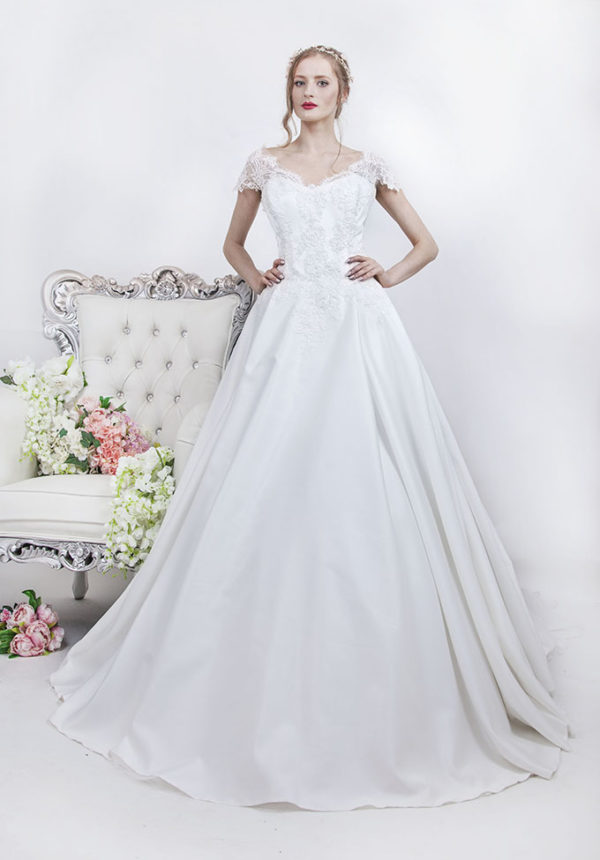 Ce modèle de robe de mariée présente un haut travaillé en dentelle et des petites manches transparentes conçues également en dentelle perlée, puis une jupe volumineuse en satin noble et une jolie traine. Il s’agit en effet d’une jolie robe de mariage présentant un bustier très près du corps. Ce dernier a des baleines intégrées à l’intérieur afin de pouvoir mettre parfaitement en valeur votre silhouette. En effet, ces baleines, couplées avec un laçage dans le dos, font office d’une gaine intégrée. Par conséquent, plus vous serrez le laçage, plus votre silhouette sera aminci. L’objectif est donc de trouver un bon juste milieu afin de sublimer votre silhouette et vous permettre de vous sentir bien à l’aise dans votre robe de mariage princesse. En effet, un tel système permet non juste de maintenir bien votre poitrine et de marquer votre taille, mais également d’aplatir votre ventre et vous assurer un très bon maintien de votre silhouette en général. Le haut est ensuite décoré avec une très jolie dentelle avec des fleurs. Cette dentelle est également brodée avec des sequins, perles et cristaux afin de rajouter à votre allure un peu de brillance sans en faire trop. Votre look restera donc toujours très élégant. La robe de mariage présente ensuite des bretelles conçues en dentelle qui a une très jolie finition sous forme de vagues qui tombent délicatement sur vos épaules et les habillent pour une allure tendre et sensuelle.